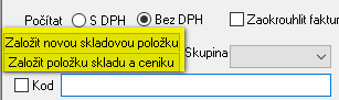 Pokud potřebujeme dodat do skladu položky, které třeba nemáme založené a již jsme rozjeli příjemku. Můžeme si vytvořit novou skladovou položku anebo skladovou a ceníkovou položku přes funkce.