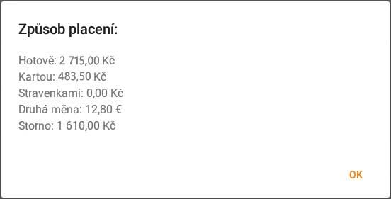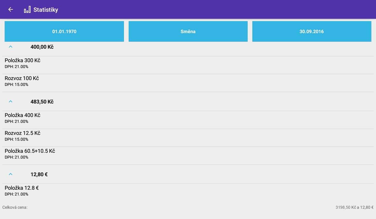 V Pokladní kalkulačce se evidují všechny ukončené účty, které byly buď to uzavřeny prodejem popřípadě stornovány. Účty jsou vyobrazeny celkovou cenou a použitou měnou. Po rozbalení jednoho z nich si můžete nechat zobrazit všechny řádky s vloženou hodnotou ceny či použitou strukturou. U každého vloženého řádku se navíc eviduje použitá sazba. Součtem celkové ceny všech účtů je znázorněno v dolní části, která je navíc rozdělena na primární a cizí měnu. Statistiky prodeje je možné filtrovat podle směny nebo data Od-Do.